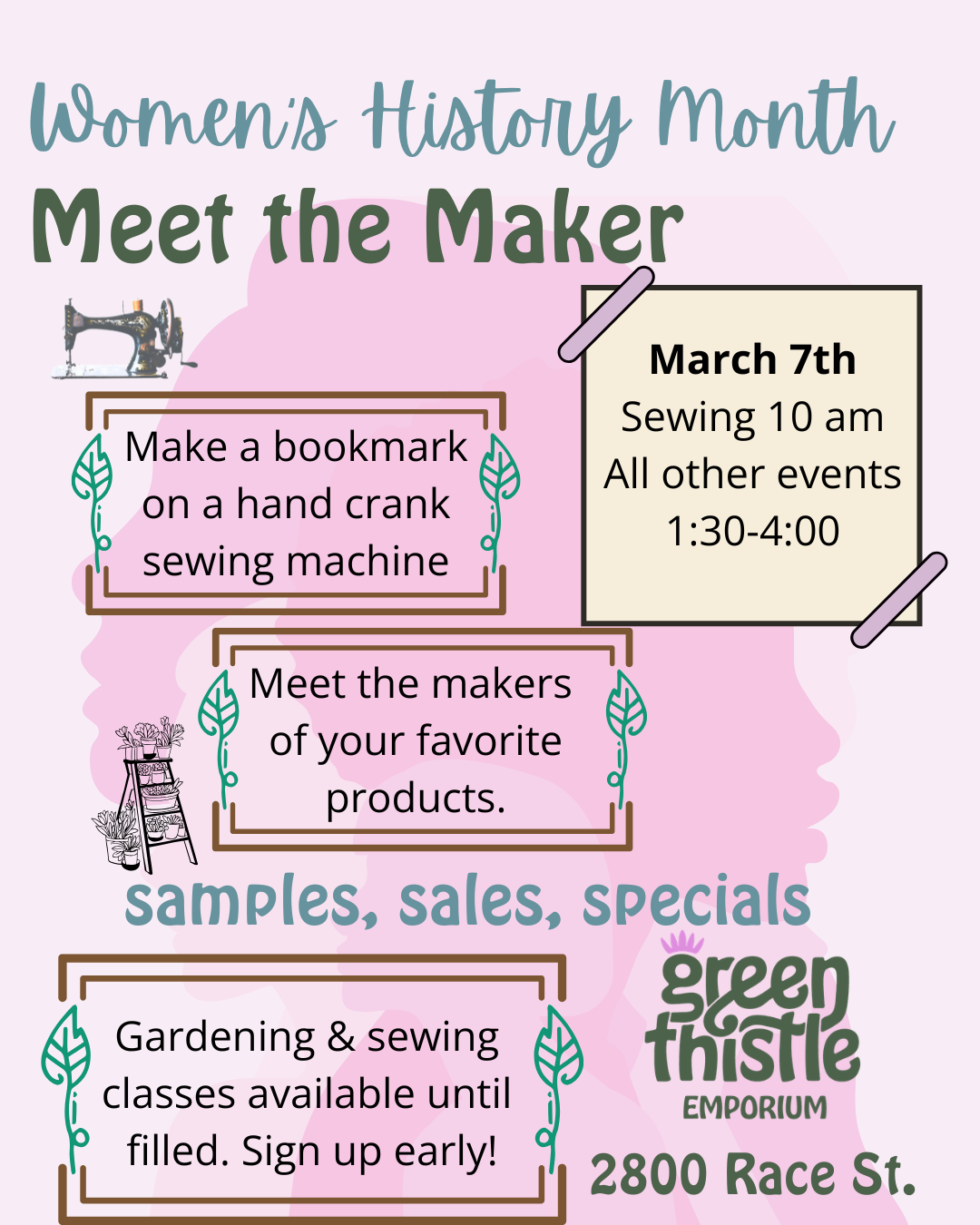 UPCOMING EVENTS UPCOMING EVENTS UPCOMING EVENTS meet the maker * meet the maker * meet the maker * March 7th, 10 am -4 pmGreen Thistle Emporium2800 Race St. Beginning Sewing, March 7th, 10-1, Green Thistle Emporium learn to grow your own herbs March 7th, 2 pm, Green Thistle Emporium Stained Glass for Beginners March 15th, 12 pm and 3:30, Green Thistle Emporium
